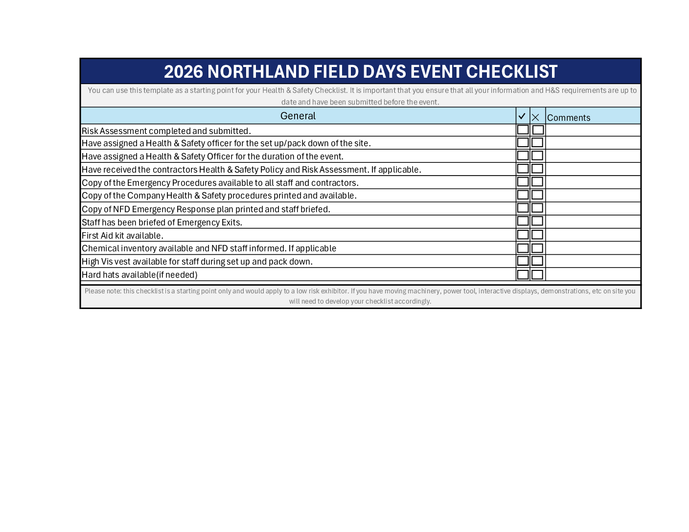 It is also your responsibility as an exhibitor to supply the Northland Field Days with a Risk Assessment Plan documenting all the risks and hazards on your site i.e. chemicals on site, moving machinery, holes, power tool demonstration, etc… and your steps to ensure the Health & Safety requirements are being met.